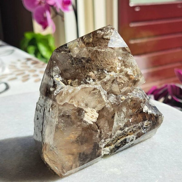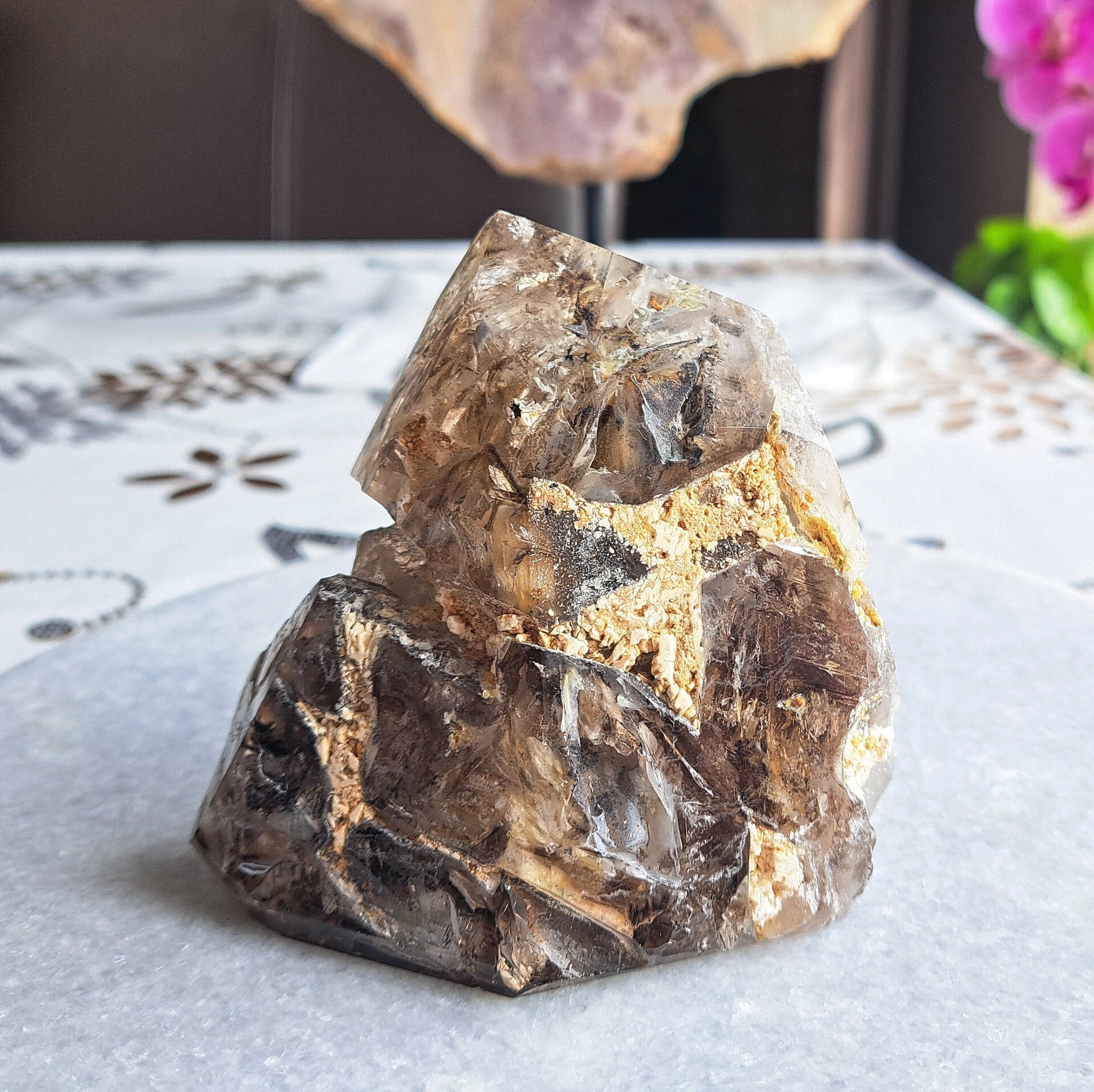 Elestial kwarts wordt ook wel krokodillenkwarts genoemd door zijn kristalgroei. Dit pronkstuk bevat ook calciet in de groeven. Ongeveer 500 gram.