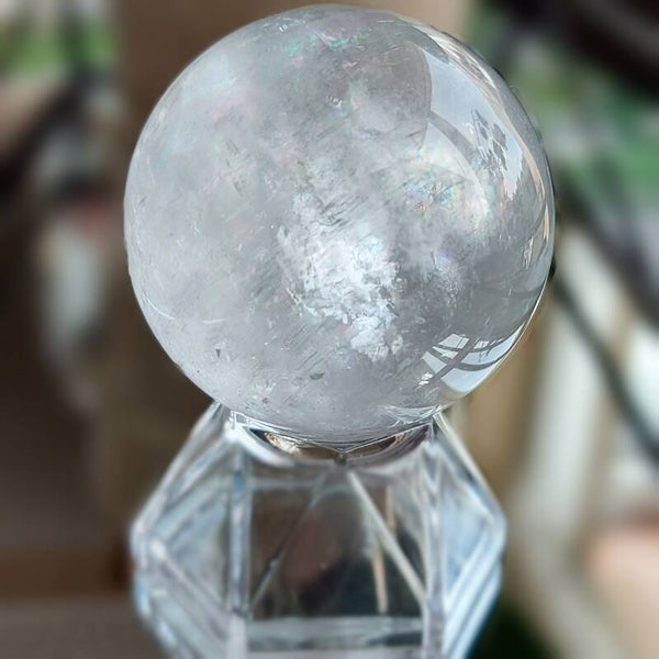 Optische calciet bol met prachtige regenbogen! Inclusief bolhouder. Optische calciet wordt ook wel IJslandspaat genoemd.