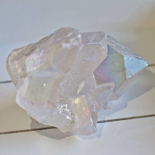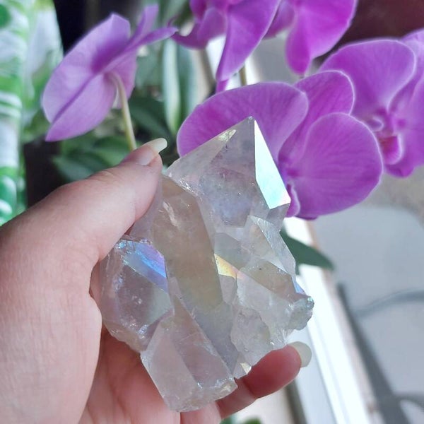 Angel aura is één van mijn favoriete stenen, door zijn prachtige en kleurrijke flash. Deze steen is uiteraard wel bewerkt met een coating. Angel aura is bergkristal met een coat eromheen. Dat geeft deze steen zijn mooie energie: de samenstelling van bergkristal, zilver en platina. Zet hem in je huis als je last hebt van stress, spanningen of negatieve gedachten. Het is ook een fijne steen om te gebruiken bij meditatie, omdat de steen je helpt verbinding te maken met je engelen en gidsen. Je kunt dit prachtige clustertje op verschillende manieren neerzetten.