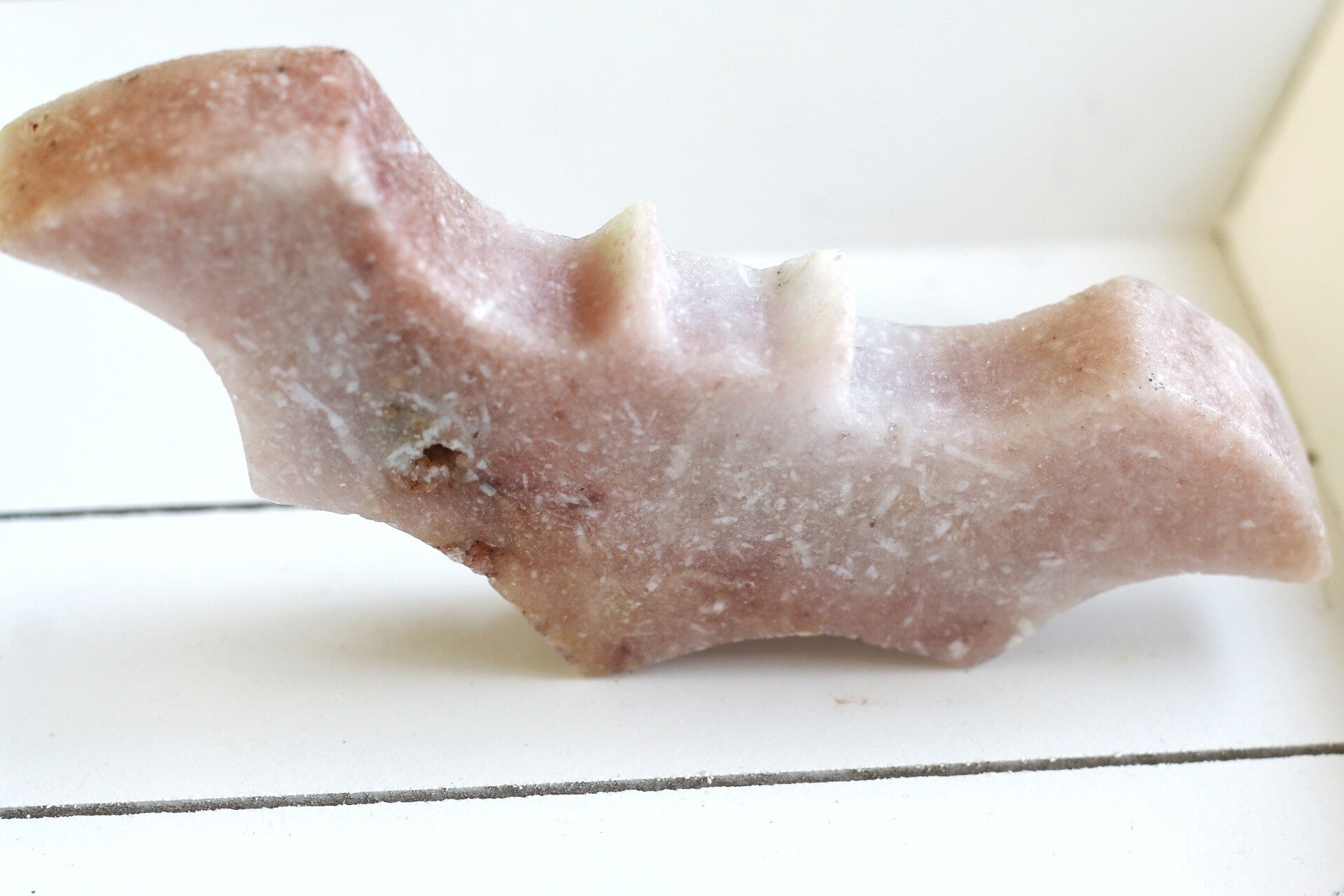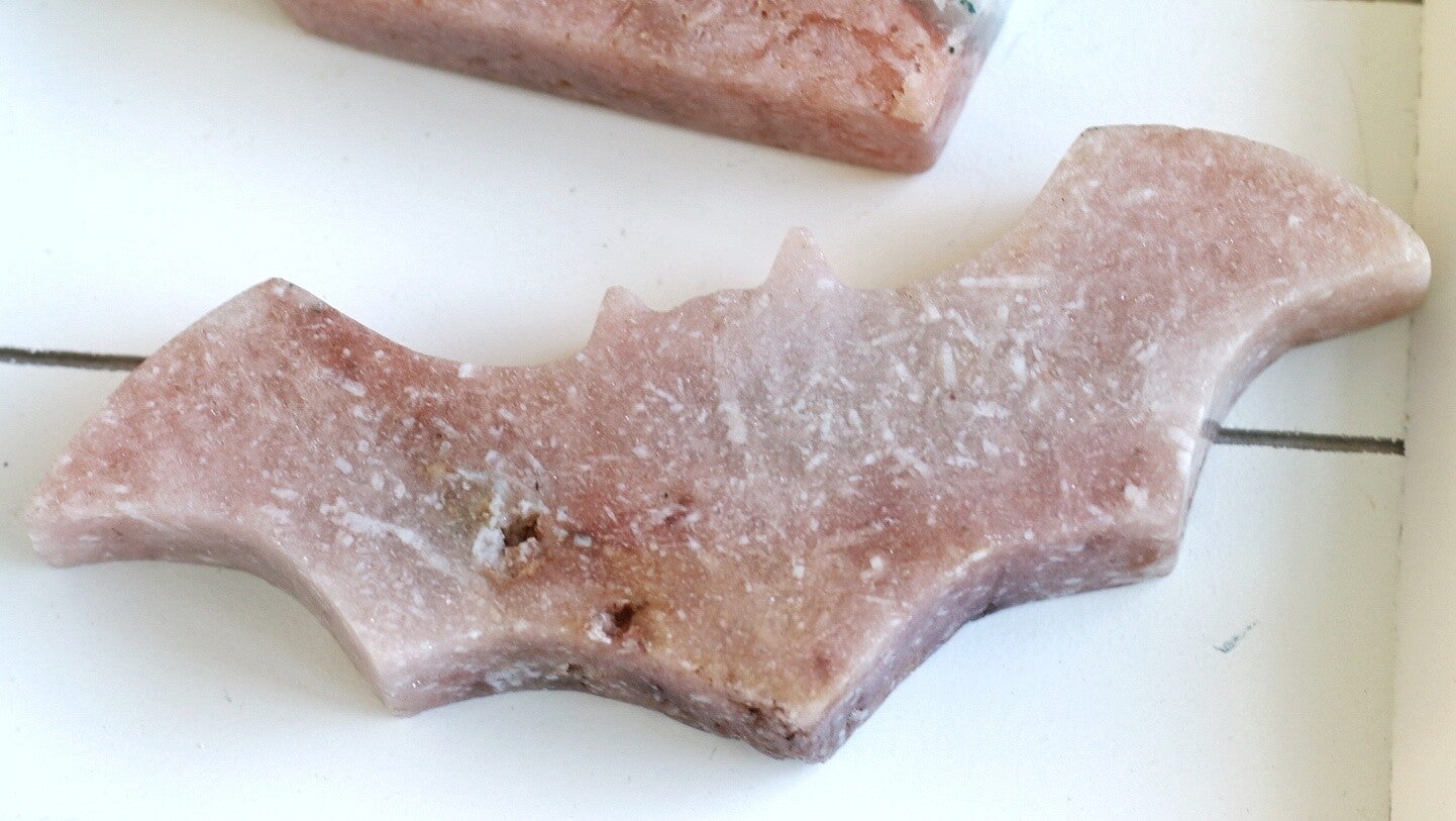 Roze amethist is de handelsnaam voor roze chalcedoon. Een prachtige roze steen met glitters er in. Ik ben er zelf helemaal weg van! Hoe leuk is deze vleermuis voor Halloween?!