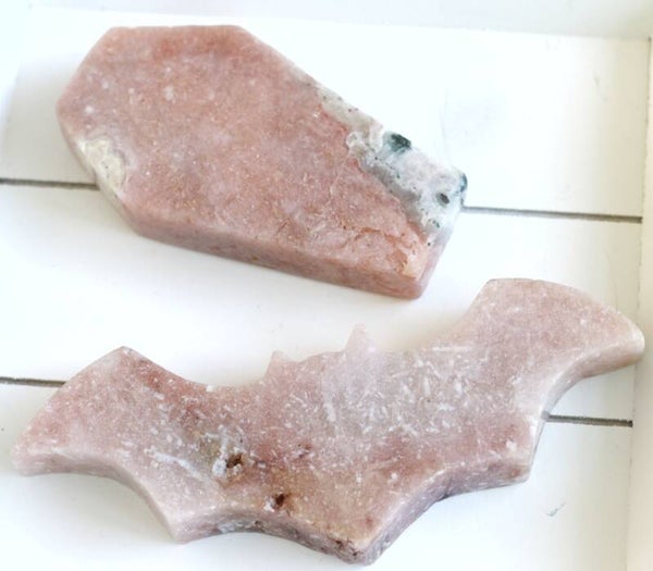 Roze amethist is de handelsnaam voor roze chalcedoon. Een prachtige roze steen met glitters er in. Ik ben er zelf helemaal weg van! Hoe tof is deze carving voor Halloween?!